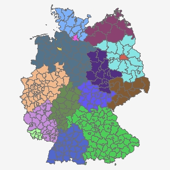 Grenzen Duitsland (2025). Een Landkreis (Spreek uit: Landkrais, Nederlands: Landkreits of district) is een regionale bestuurseenheid in de Bondsrepubliek Duitsland. Het betreft een gemeenteverbond en rechtspersoon (van publiekrecht), één bestuurlijk niveau boven de gemeente. Een Regierungsbezirk (in Saksen Direktionsbezirk) is een bestuurlijke regio in Duitsland, een onderbestuurslaag van enkele deelstaten en is onderverdeeld in districten (de Landkreis en de stedelijke Kreisfreie Stadt). De deelstaten van Duitsland (Duits: Länder of Bundesländer) zijn de zestien deelstaten van de Bondsrepubliek Duitsland. Ze hebben eigen grondwetten, parlementen en regeringen. Anders dan in niet-federalistische landen hebben de deelstaten in Duitsland vele bevoegdheden en hebben ook invloed op de federale bestuurslaag: de Bondsraad, die de deelstaatregeringen vertegenwoordigt, beslist mee over veel federale wetten. Er is geen stuk van Duitsland dat niet bij een deelstaat hoort, ieder stuk van het grondgebied van de Bondsrepubliek maakt deel uit van een van de deelstaten. De grenzen van een deelstaat kunnen alleen via een plebisciet worden veranderd. Noordrijn-Westfalen telt de meeste inwoners, qua oppervlakte is Beieren het grootst. (bron: Wikipedia)